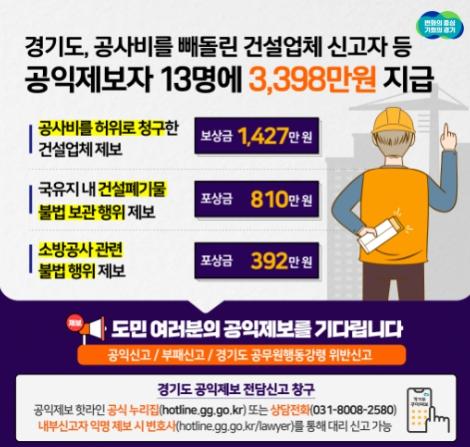 도는 지난 8일 2022년도 제3차 경기도 공익제보지원위원회를 열고 보상금 1건 1,427만 원과 포상금 12건 1,971만 원 등 총 3,398만 원을 지급하기로 했다고 22일 밝혔다.