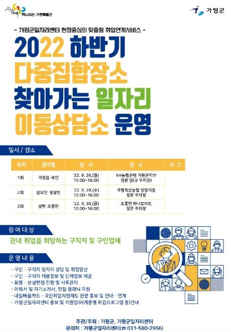 [한국뉴스타임=편집국] 가평군은 관내 유동인구 밀집 지역 및 접근성이 높은 다중집합시설로 직업상담사가 직접 찾아가 다양한 구인·구직 인프라 구축 및 일자리센터 인지도 향상을 위한 '2022 하반기 찾아가는 일자리 이동상담소'를 오는 9월 26일 가평읍【NH농협은행 가평군지부 정문 앞(구 주차장)】에서 운영한다고 밝혔다.