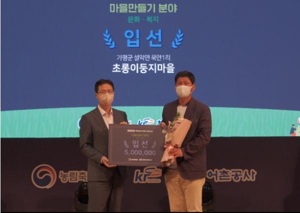 [한국뉴스타임=편집국] 가평군은 지난 22일 KT대전인재개발원에서 농림축산식품부 주최 '제9회 행복 농촌만들기 콘테스트' 마을만들기 문화·복지분야에서 묵안리 초롱이 둥지마을이 우수마을로 입선하여 농어촌공사 표창과 시상금 500만원을 수상했다.