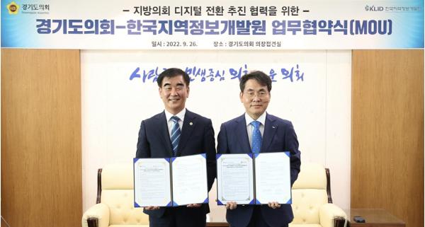 경기도의회(의장 염종현)와 한국지역정보개발원(KLID)이 업무협약을 체결하고, 자치분권 2.0시대를 맞아 ‘지방의회 디지털 전환’을 추진하기 위한 공동의 노력을 기울이기로 했다.
