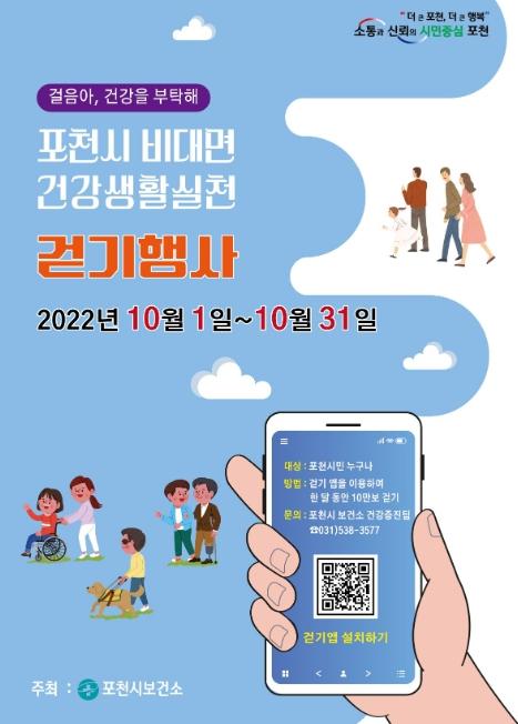 [한국뉴스타임=편집국] 포천시 보건소는 다음달 1일부터 한달간 신체적 건강증진을 위한 ‘2022년 건강생활실천 걷기행사’를 운영한다.