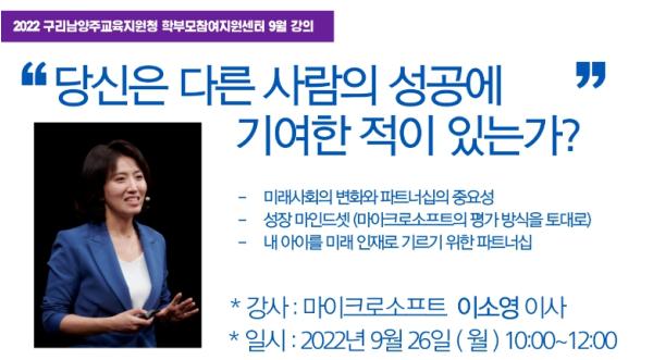 [한국뉴스타임=편집국] 구리남양주교육지원청은 관내 초, 중, 고 학부모 대상으로 9월 26일 '당신은 다른 사람의 성공에 기여한 적이 있는가?' 주제로 미래인재 기르기에 대한 연수를 진행했다.