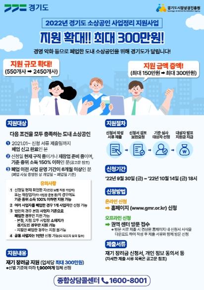 ‘사업정리 지원사업’은 경기도 내 폐업한 소상공인의 충격 완화 및 재기를 지원하는 사업으로 민선 8기 민생경제 추경을 통해 지원사업의 지원금액과 지원 규모를 모두 확대했다. 경기도 내 폐업 소상공인 1,900여개 업체 지원을 목표로 하는 이번 지원은 업체당 최대 300만 원의 지원금이 지급된다.
