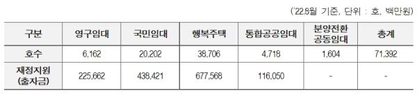 건설형 공공임대주택은 LH가 정부 등 재정을 지원받거나 직접 재원을 조달해 건설 후 사회취약계층의 주거안정을 위하여 임대하는 주택으로, 최저소득 계층 대상 영구임대주택은 6,162호, 저소득층 대상 국민임대주택은 20,202호, 대학생, 사회초년생, 신혼부부 등 젊은 층 대상 행복주택은 38,706호, 여러 사회취약계층 등을 대상으로 하는 통합공공임대주택은 4,718호, 분양전환 공공임대주택은 1,604호 등이 미착공 물량으로 남아 있는 상황이다.