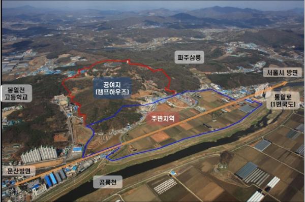 캠프하우즈는 1953년 미군에 공여되고 2004년 미군의 철수, 2007년 한국군에 반환된 지역이다. 2009년 사업자 공모를 통해 A사를 선정해 2014년에 도시개발구역으로 지정(개발계획)돼 2016년부터 실시계획 인가 절차를 진행했으나 파주시와 체결한 협약의 미이행과 사업시행승인조건 미이행, 실시계획 인가 요건 미충족 등의 사유로 파주시는 2018년 9월 사업시행자 지정 취소 처분했다. A사는 행정소송을 제기했으나 2019년 12월 파주시가 승소(1심)했으며 현재 2심이 진행중이다.