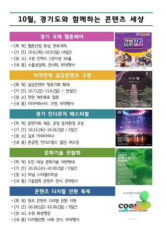 [한국뉴스타임=편집국] 경기도와 경기콘텐츠진흥원이 문화콘텐츠 창작자에게는 공연·전시 기회를, 도민에게는 콘텐츠 체험 기회를 제공해 창작자와 도민 간 소통·교류의 장을 마련하고, 콘텐츠 산업 저변확대를 위해 10월 한 달간 웹툰·문화기술 등 콘텐츠 관련 행사 5개를 연이어 개최한다.