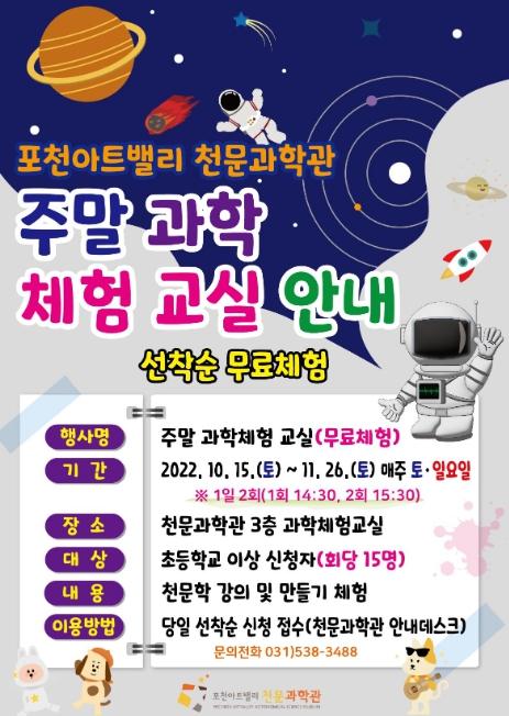 [한국뉴스타임=편집국] 포천시 포천아트밸리 천문과학관은 오는 15일부터 학생 및 관람객을 대상으로 ‘주말 과학체험교실’을 운영한다.