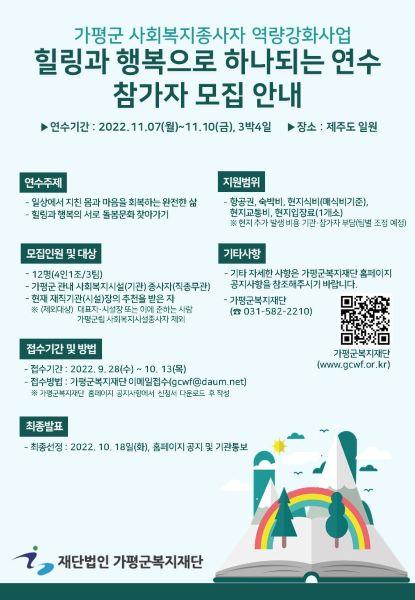 [한국뉴스타임=편집국] 가평군복지재단은 2022년 힐링과 행복으로 하나되는 연수 참여자를 10월 13일까지 모집한다.