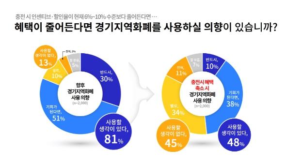 경기도는 지난 9월 15일부터 26일까지 도민 2천 명을 대상으로 실시한 여론조사 결과 향후 경기지역화폐 사용 의향은 81%(1천620명)로 매우 높은 고객충성도를 보였지만 현재 6~10% 수준의 인센티브 또는 할인율이 줄어들 경우 지역화폐 사용 의향 비율이 48%(960명)로 감소했다고 5일 밝혔다.