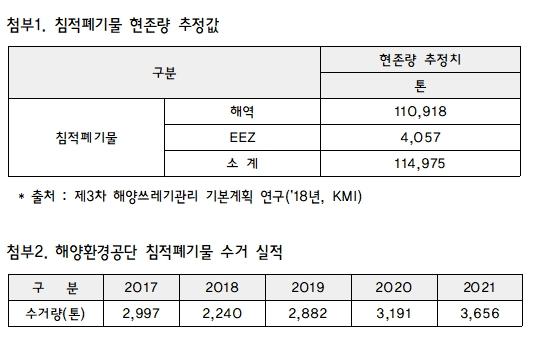 하지만 해양폐기물 정화사업 관련 2023년 예산안을 살펴보면, 전국 주요 59개 항만, 9개 환경관리해역, 30개 해양보호구역 등의 지속적인 침적쓰레기 수거를 위해 168억원이 책정되어 있으며, 수거처리 목표는 6,000톤에 그쳤다. 전체 침적폐기물 추정치 11만4,975톤의 5%에 불과하며, 주요 항만·해역 침적폐기물 수치의 절반에도 못미친다.