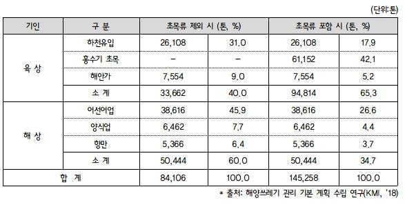 국회 농림축산식품해양수산위원회 소병훈 위원장(더불어민주당, 경기광주갑)이 해양수산부로부터 제출받은 '해양쓰레기 발생 현황'에 따르면, 해양쓰레기 발생량은 연간 14.5만 톤으로 나타나고 있으며, 육상 기인이 65%(9.5만 톤), 해상 기인이 35%(5만 톤)를 차지하고 있으나, 초목류를 제외하면 해상 기인이 60% 수준인 것으로 보고됐다.