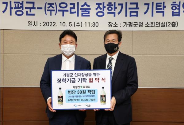 [한국뉴스타임=편집국] 지난 5일, 가평군과 ㈜우리술이 장학기금 기탁 협약을 맺었다.