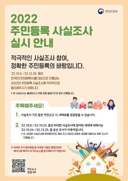 [한국뉴스타임=편집국] 포천시는 10월 6일부터 12월 28일까지 시민을 대상으로 ‘2022년 주민등록 사실조사’를 실시한다.