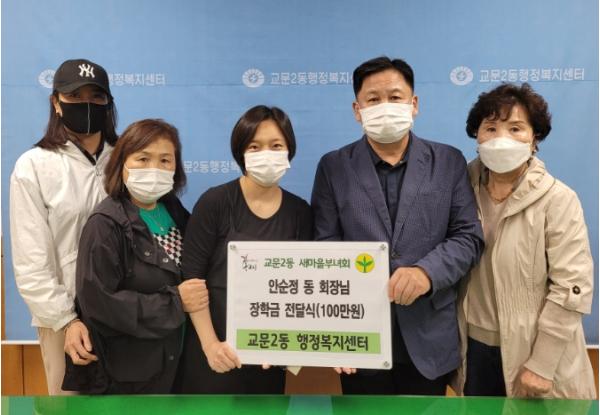 [한국뉴스타임=편집국] 구리시 교문2동은 6일 교문2동 새마을부녀회 故안순정회장 유가족으로부터 저소득 학생들을 위한 장학금 1백만원을 전달받았다.