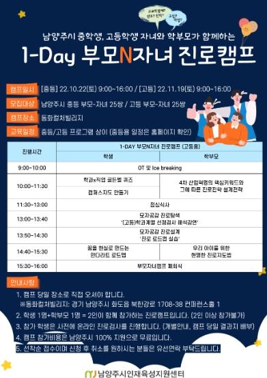 [한국뉴스타임=편집국] 남양주시는 오는 10월 22일과 11월 19일 두 차례에 걸쳐 진행되는 ‘1-Day 부모N자녀 진로캠프’ 프로그램 참여자 100명을 선착순으로 모집한다고 7일 밝혔다.