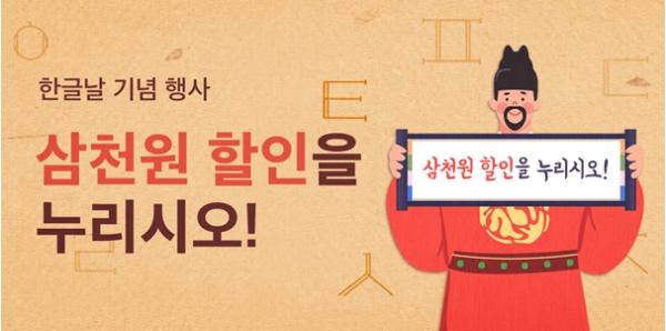 경기도주식회사는 576돌 한글날을 맞아 10월 10일 월요일부터 오는 13일 목요일까지 나흘간 3,000원 할인 쿠폰을 제공하는 ‘한글날 기념 삼천원 할인을 누리시오’ 이벤트를 진행한다고 밝혔다.