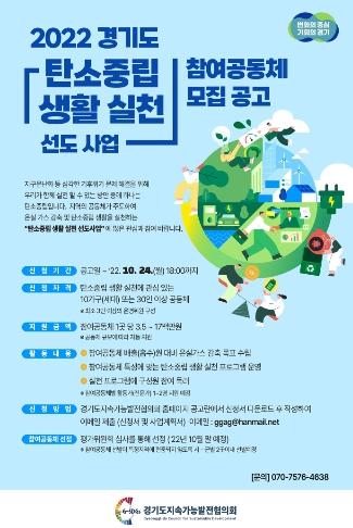 [한국뉴스타임=편집국] 경기도가 오는 24일까지 ‘2022년도 탄소중립 생활 실천 선도사업’ 참여공동체를 모집한다.