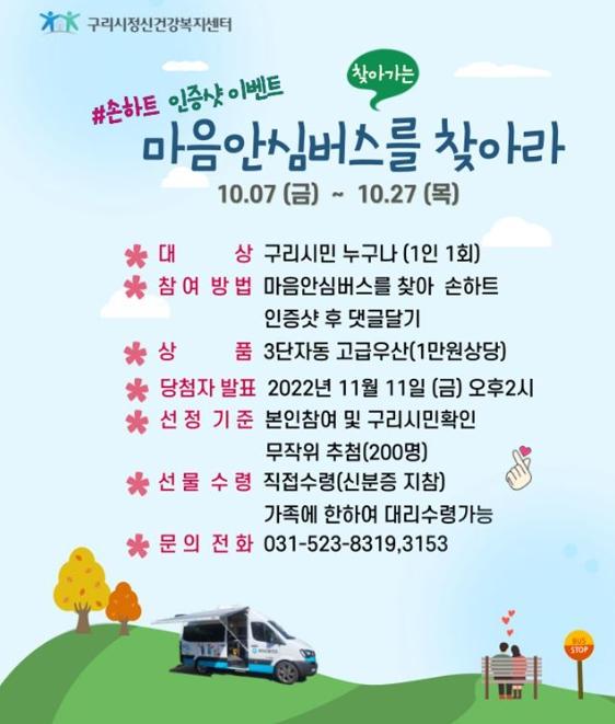 구리시(시장 백경현) 정신건강복지센터는 10월 7일부터 27일까지 ‘세계 정신건강의 날(10월 10일)’을 기념하여 구리시민의 정신건강을 증진하고자 ‘마음안심버스를 찾아라’ 손하트 인증샷 이벤트를 진행한다.