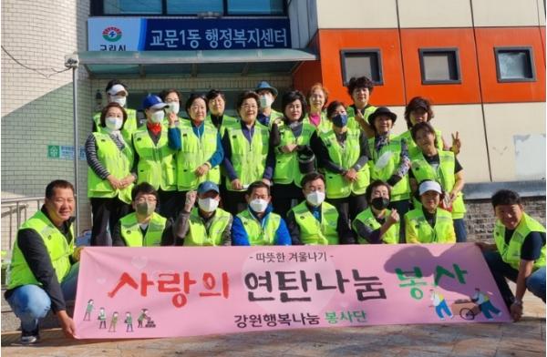 [한국뉴스타임=편집국] 구리시는 8일 강원행복나눔 봉사단 후원으로 교문1동 거주 독거어르신 7가구에 연탄 각 300장씩 총 2,100장을 직접 배달해 드리는‘따뜻한 연탄 나눔’봉사활동을 펼쳤다.