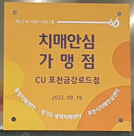 [한국뉴스타임=편집국] 포천시보건소 치매안심센터는 치매 안전망 구축을 위해 신읍동 소재 ‘CU 포천신읍가나안점’. 내촌면 소재 ‘CU포천금강로드점’ 등 2개소를 ‘치매안심가맹점’으로 지정했다.