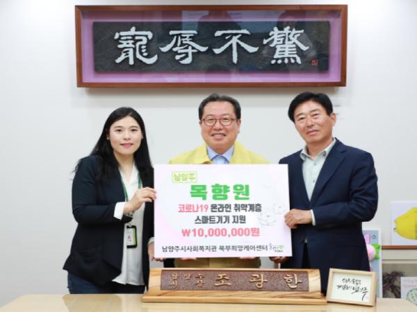 남양주시(시장 조광한)는 2일 별내동 소재 목향원(대표 한성우)에서 온라인 취약계층 스마트기기 지원을 위한 기부금 1,000만원을 북부희망케어센터를 통해 지정 기부했다고 밝혔다.
