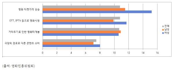 한편 이러한 회복세에도 불구하고 7월 대비 8월의 매출액이 2004년 이래 최대 감소폭을 보였다. 이는 코로나19 이후, 영화 티켓 값이 상승하면서 극장 관람 횟수가 줄어들었고, OTT를 활용한 영화 접근이 증가하면서 이러한 결과가 발생한 것으로 나타났다.