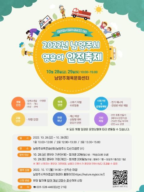 [한국뉴스타임=편집국] 남양주시는 오는 28일부터 29일까지 이틀간 남양주체육문화센터에서 관내 어린이집 및 영유아 가정을 대상으로 ‘2022년 영유아 안전 축제’를 개최한다.
