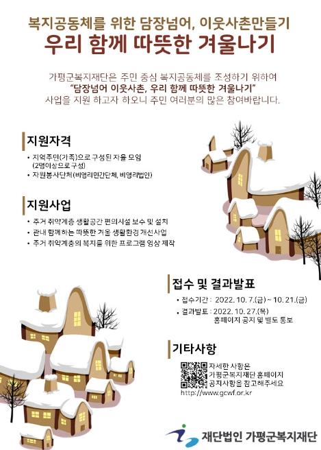 [한국뉴스타임=편집국] 가평군복지재단은 2022년 10월 이웃이 이웃을 돌보는 공동체적 돌봄문화 조성과 주민주도적 돌봄 복지공동체를 조성하기 위하여 ‘우리 함께 따뜻한 겨울나기’ 사업을 추진한다.