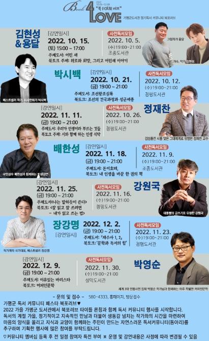 이러한 ‘북포러브’는 지난 10월 5일 조종도서관에서 진행된 『어린 새(저자: 김현성&용달)』 사전 독서모임으로 그 막을 열었다. 오는 △10월 15 (토) 에는 조종도서관에서 김현성&용달 북토크가 진행될 예정이며 △10월 21일 (금)에는 청평도서관에서 시사만화가 박시백 북토크가 진행된다. 해당 행사에 앞서 △10월 12일(수)에는 박시백 작가의 『조선왕조실록』을 먼저 읽어보는 사전 독서모임이 준비되어 있다. 11월, 12월에도 배한성 성우, 장강명 작가 등 쟁쟁한 명사들을 직접 만나볼 수 있는 자리가 이어질 예정이다.