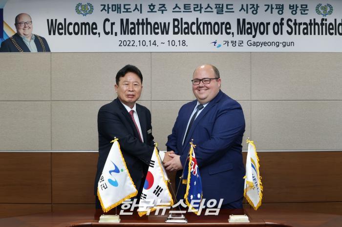 17일 오전 서태원 가평군수는 가평군을 방문한 자매도시 호주 스트라스필드시 블랙모아 시장의 예방을 받고 양도시 상생 발전 방안에 대해 협의했다.
