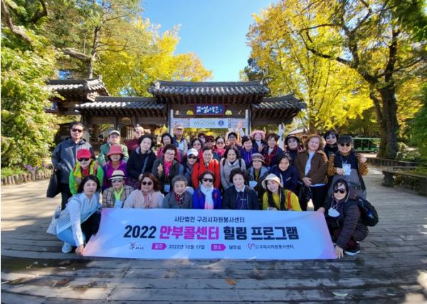 [한국뉴스타임=편집국] 구리시자원봉사센터는 지난 17일 강원도 춘천 남이섬에서 구리시 안부콜센터 봉사자 30여 명을 대상으로 '2022년 안부콜센터 힐링프로그램'을 실시했다.