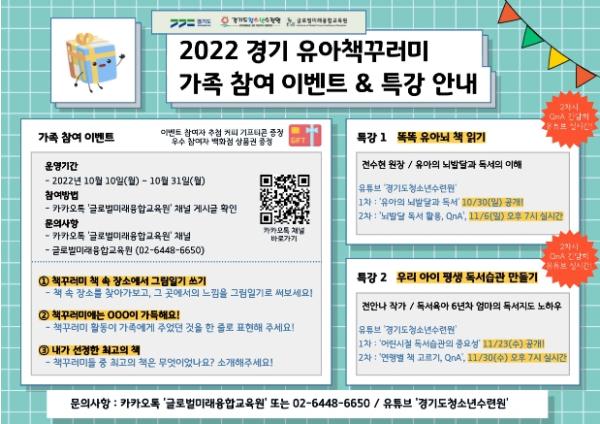 행사 참여는 사업수행기관인 경기도청소년수련원 누리집 공지사항과 카카오톡 채널 ‘글로벌미래융합교육원’을 통해 할 수 있다. 한편, 제공된 책은 사업 이후 일괄 회수해 지역사회에 12월에 기증될 예정이다.