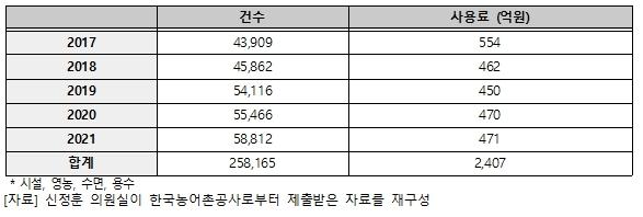 한편, 지난 5년간(2017~2021년) 공사의 시설토지, 수면, 용수의 사용허가 수익은 2,407억원이었다[표3]. 그간 농업생산기반 시설을 골프장, 낚시터 등 목적외로 사용허가하여 수익을 취했다는 비판이 끊이질 않았다.
