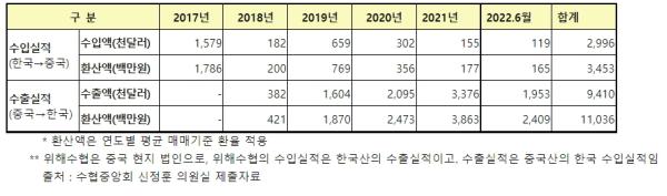 국회 농림축산식품해양수산위원회 신정훈 의원(더불어민주당·나주화순)이 수협중앙회로부터 제출받은 자료에 따르면, 위해수협을 통한 한국산 수산물의 대중수출액은 2017년 17억 8,600만원에서 2021년 1억 7,700만원으로 1/10 수준으로 급감한 반면, 중국산 수산물의 한국 수출액은 2017년 0원에서 2021년 38억 6,300만원으로 급증한 것으로 확인됐다. 2017년부터 올해 상반기까지 5년 새 위해수협을 통한 국산 수산물 수출액은 34억 5,300만원에 그쳤지만, 동기간 중국산 수산물의 수입액은 110억 3,600만원에 달했다._표1