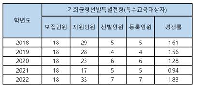 특히, 특수교육대상자 특별전형은 정원 외 모집임에도 불구하고 선발인원이 모집인원 대비 절반에 불과하다는 것은 장애 학생들에게 대학 입학이 얼마나 높은 벽이었는지 실감하게 한다.