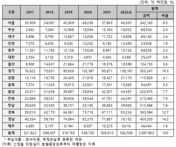 2017년부터 올해 상반기까지 지역별 부실대출금은 경기(19.3%), 경남(14.2%), 경북(12.7%), 서울(8.5%) 순으로 많았다[표1].
