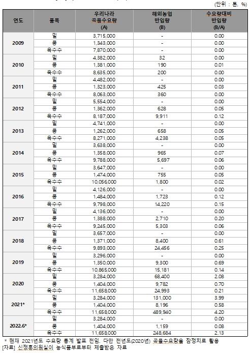 품목별 곡물수요량 대비 반입량은 콩 0.58%, 밀 3.99%에 그쳤고, 가장 양호한 옥수수도 4.2% 수준이었다.