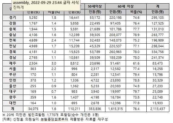 국회 농림축산식품해양수산위원회 신정훈 의원(더불어민주당·나주화순)이 농협중앙회로부터 제출받은 자료에 따르면, 올해 8월 기준 전체 농ㆍ축협 조합원 211만명 중 60세 이상은 162만명(76.4%)인 것으로 확인됐다. 40대 미만은 3만명(1.6%)에 불과했다.