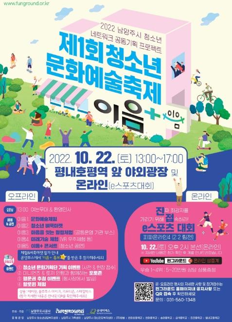 이번 축제는 22일 오후 1시부터 5시까지 평내호평역 야외 광장 및 온라인에서 진행되며, 청소년 문화 예술 동아리들이 참여하는 공연과 모의 창업 활동을 경험해 볼 수 있는 청소년 플리 마켓, 관내 학교 동아리 및 펀 그라운드 진접의 청소년 자치기구가 직접 기획·운영하는 문화 예술 체험과 미래 기술 프로젝트, e-스포츠 대회 등으로 구성됐다.