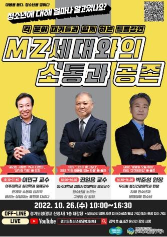 경기도가 주최하고 경기도청소년상담복지센터가 주관하는 이번 특별강연은 ‘MZ세대와의 소통과 공존’이 주제다.