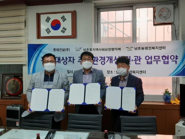 이번 업무협약을 통해 롯데건설(주)는 남촌동 복지대상자의 주거환경 개선을 위해 전문가의 손길이 필요한 지역 내 저소득층 가구를 대상으로 무료 도배·장판ㆍ시설개선 등 ‘복지소외 계층 주거환경개선 서비스 제공' 에 협력하기로 뜻을 모았다.