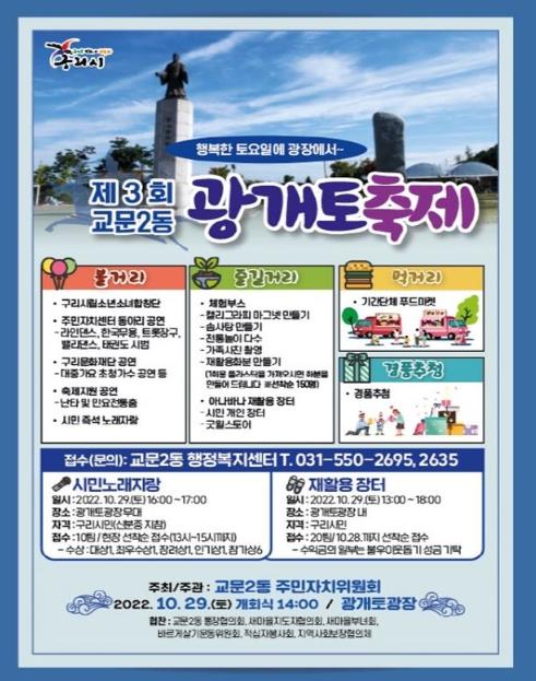 [한국뉴스타임=편집국] 구리시에서는 교문2동 주민자치위원회(위원장 이종성) 주관으로 10월 29일 광개토태왕 광장 일원에서 “제3회 광개토축제”를 개최한다고 밝혔다.