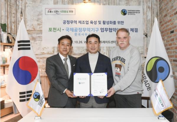 [한국뉴스타임=편집국] 포천시는 지난 26일 서울특별시 종로구에 소재한 페어트레이드 센터에서 국제공정무역기구 한국사무소(대표 지동훈)와 상생협력, 포천시 공정무역 제조업체 육성, 공정무역 활성화를 목적으로 업무협약을 체결했다.