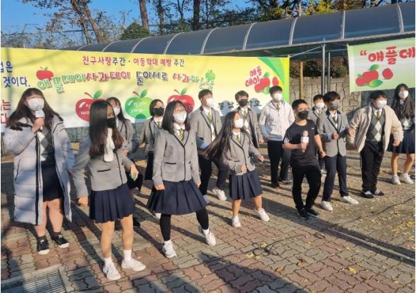 이날 애플데이 행사에서 등교하는 학생들에게 △아침음악회, △포토존, △아동학대 예방과 4행시, △오성과 한음 인형탈, △아동학대 예방 캠페인, △사과함 운영, △사과 나눔 행사를 통해 교내에 아동의 권리 그리고 친구의 소중함을 전파했다.