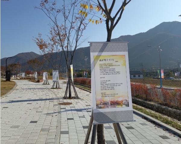 가평군문인협회에서 10월 27일부터 회원 20명이 참여하여 27점의 시화족자 작품을 공원에 전시하여 붉게 물들어가는 단풍나무와 자연과 문학이 오묘하게 어우러져 장관을 이루고 있기 때문이다.