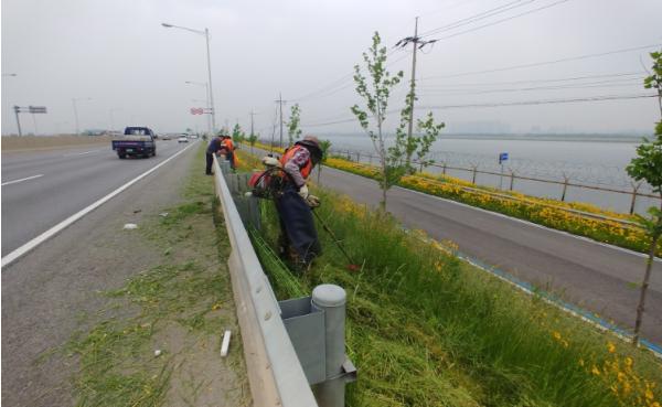김포시(시장 정하영)는 깨끗한 도로환경 조성의 일환으로 김포한강로를 포함한 관내 주요 도로변 제초작업을 실시하고 있다.