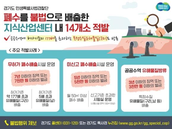 경기도 특사경은 10월 4일부터 21일까지 지식산업센터가 밀집한 수원·화성·안양·군포·의왕·부천·김포·성남·하남 총 9개 시의 지식산업센터 내 폐수 배출 사업장 120개소를 중점 단속한 결과, 물환경보전법을 위반한 14개소를 적발했다고 3일 밝혔다.