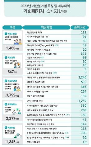 두 번째, 기회수도 경기도를 만들기 위한 ‘기회예산’으로는 ▲기회사다리 ▲기회소득 ▲기회안전망 ▲기회발전소 ▲기회터전 등 5대 사업에 1조 531억 원을 새롭게 투입했다.