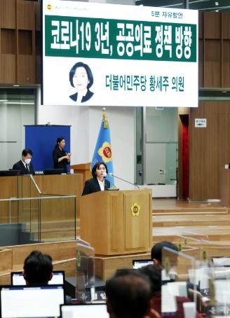 황세주 경기도의원(보건복지위원회, 더민주, 비례)은 3일, 제365회 경기도의회 정례회 제3차 본회의에서 ‘코로나19 3년, 공공의료 정책 방향’ 을 주제로 5분 자유발언을 가졌다.