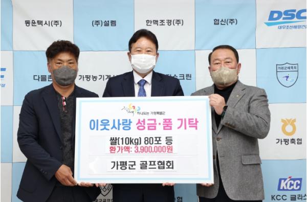 [한국뉴스타임=편집국] 지난 11월 3일 ‘가평군 골프협회(회장 원기연)’에서는 다가오는 겨울을 맞아 어려운 이웃과 따뜻한 온정을 나누기 위해 가평군청을 방문하여 390만원 상당의 쌀(10kg) 80포와 곰탕 등을 전달했다.